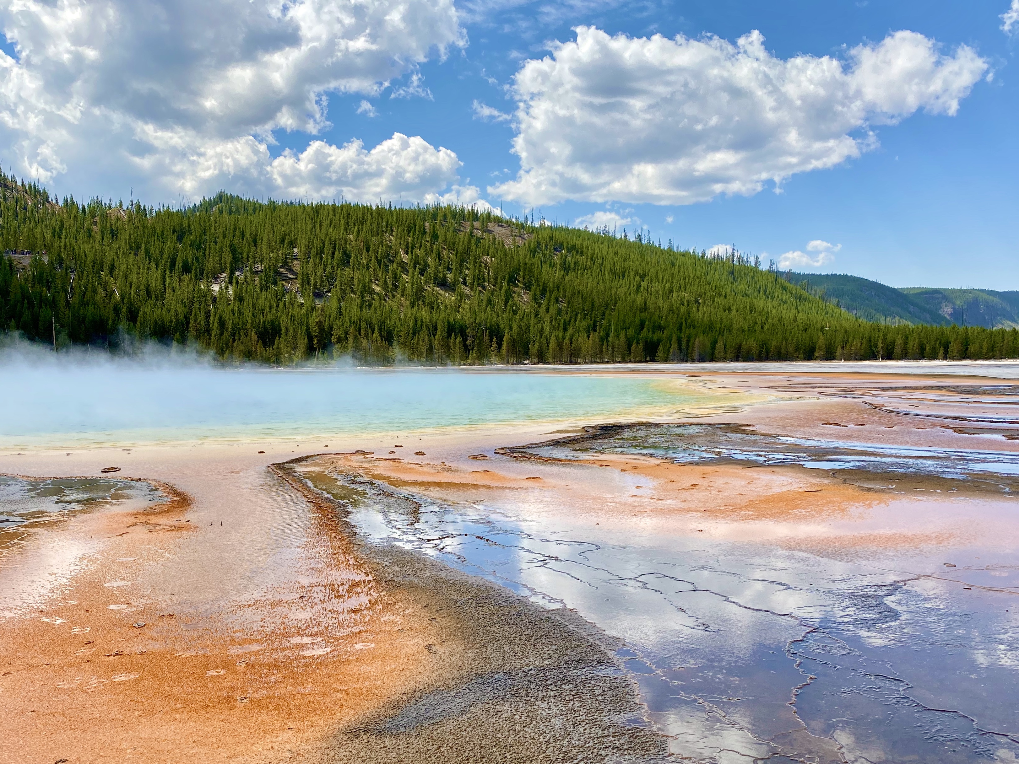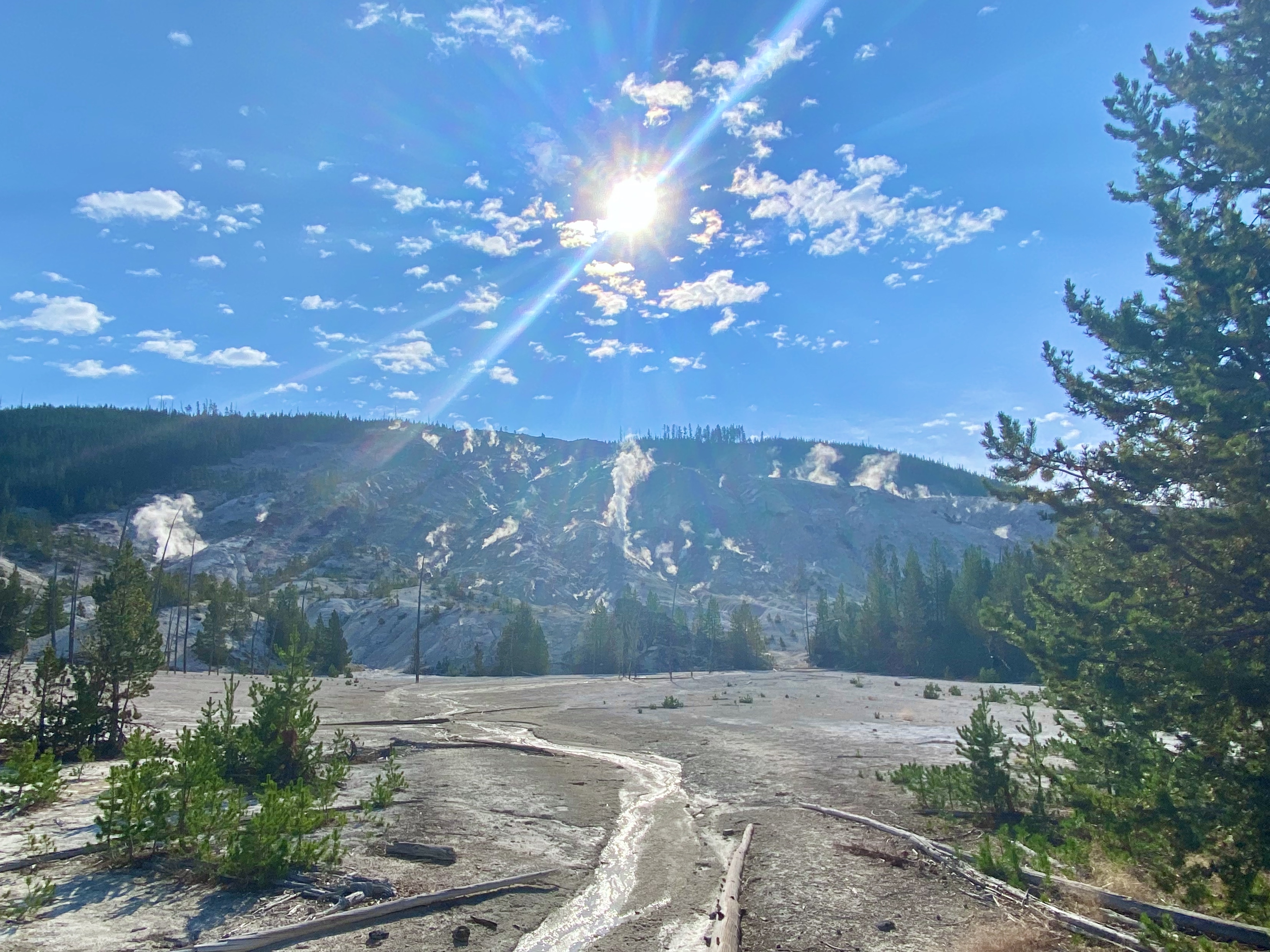 This morning we grabbed a coffee, filled up our water bottles (they have the best filing stations around the park) and hit the road. Along the road there are a ton of pull-offs, all with interesting names. Our first stop was Roaring Mountain (where the mountain smoked with many thermal vents), then onto Clearwater Springs and Frying Pan Springs (both springs which had hot, steamy bubbly ground waters). Most of the side stops have wooden plank pathways, to ensure you don’t fall into the boiling earth below.