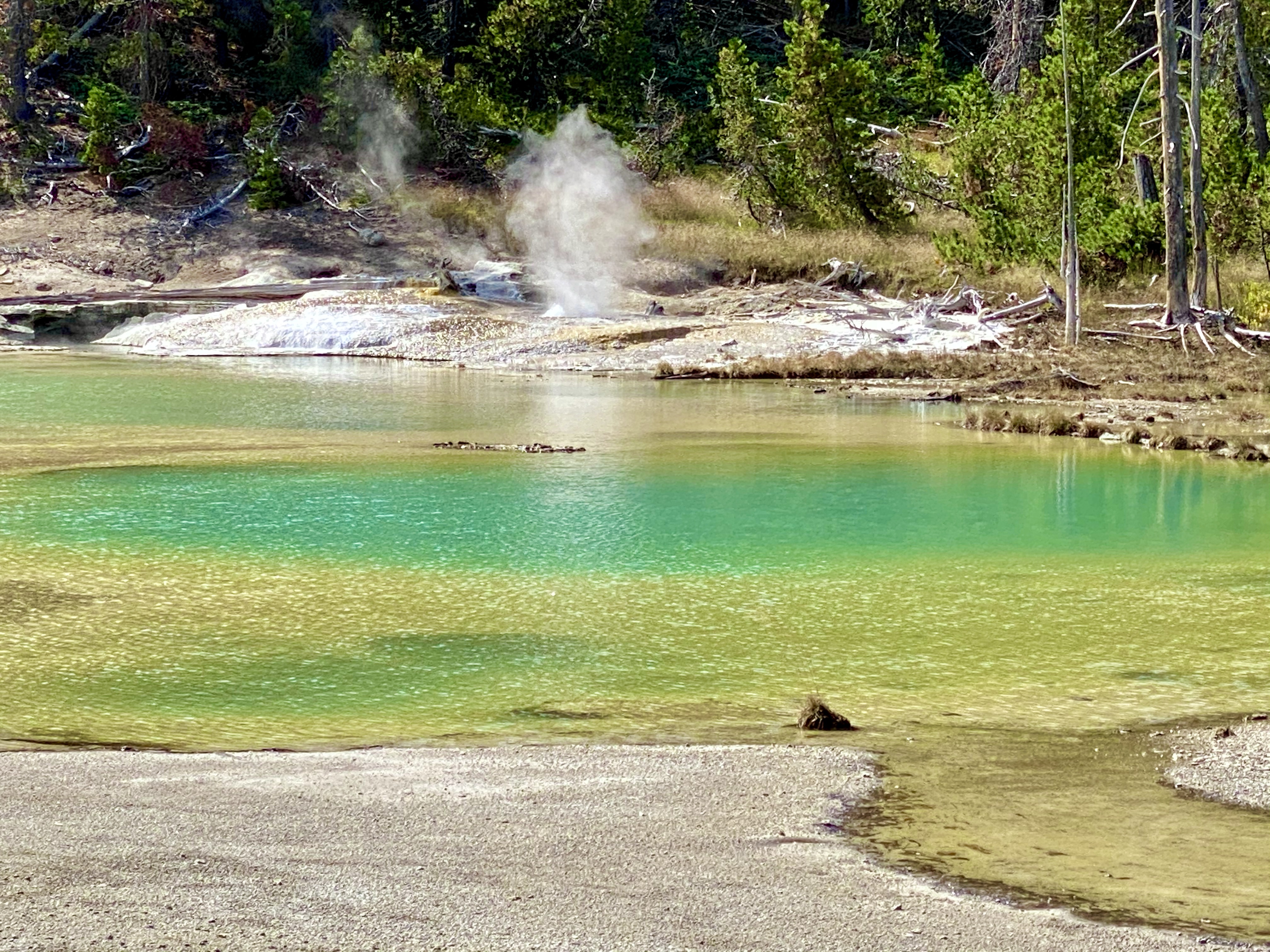 2. Up near Mammoth Hot Springs (between Mammoth and Gardiner) is the Boiling River, which was closed this year, due to Covid (as it draws big crowds). This is a section of river where a hot spring feeds into and you can safely sit in a spa like thermal spring.