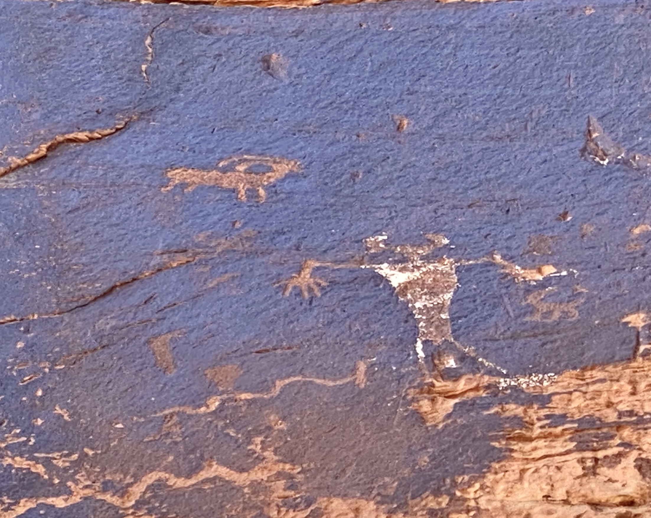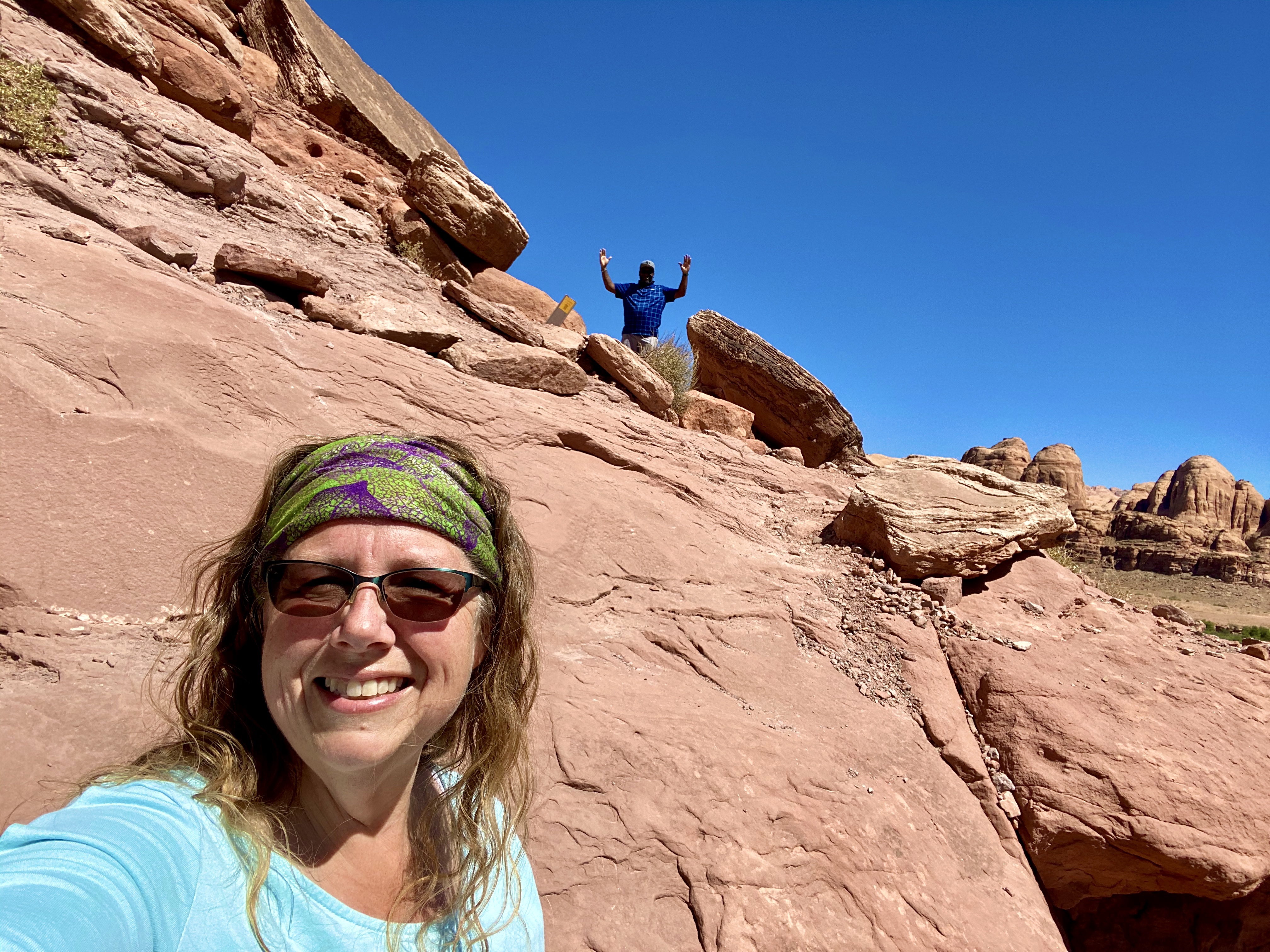 One crowdless gem was a short .6 mile trek on the Poison Spider Trail, which takes you to some dinosaur tracks and petroglyphs. It was quite the scramble up the rocks, so much so, that just as we nearly hit the top, I listened to my gut (and my shaky legs), and stopped. The vision of one bad misstep and falling backwards got embedded in my head, so I tapped out. Ken however, who loves to climb rocks, was in his element and went ahead of me to take photos of the dinosaur tracks. The tracks were from Eubrontes (about 6 feet tall) and Grallator (size of a turkey) dinosaurs. The tracks are embedded in Navajo Sandstone and dated over 190 millions years ago.