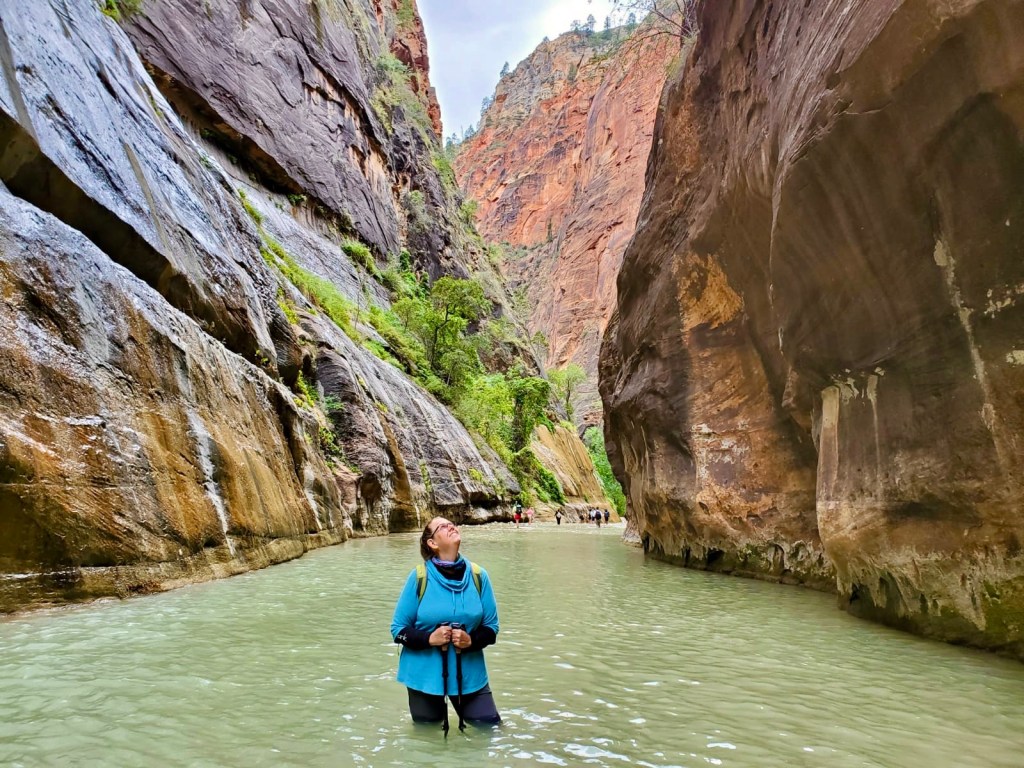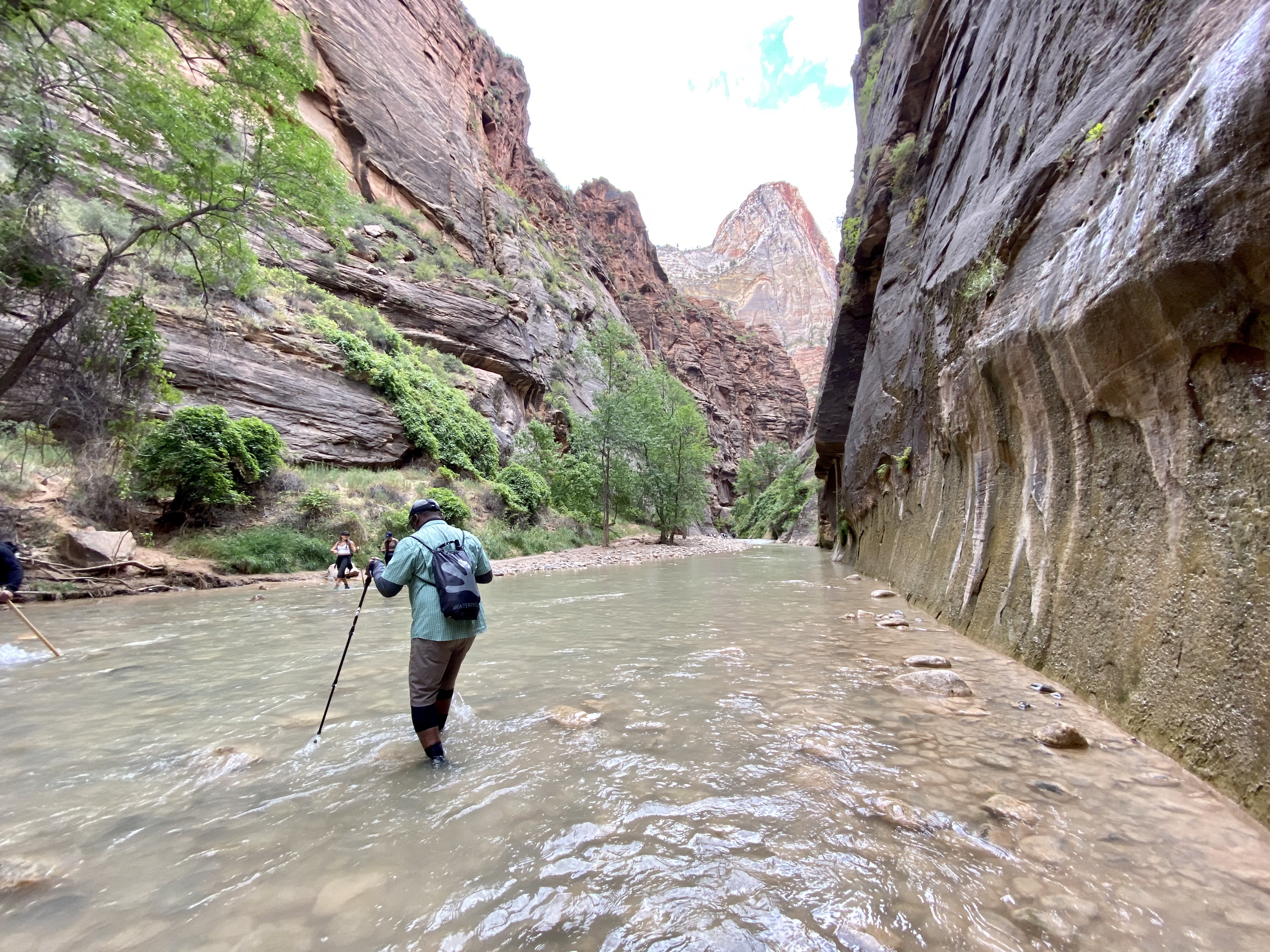 So, hiking The Narrows has been on my bucket list since we were here 5 years ago. We were not prepared then, and I had a broken baby toe, so it wasn’t meant to be. But this time, we made every effort to be prepared! Yesterday we went to the Zion Outfitters store and rented neoprene socks (scuba suit material), to help keep our feet warm from the cold river water. We decided to use our own hiking shoes and trekking poles, however you can rent shoes and large wooden sticks.